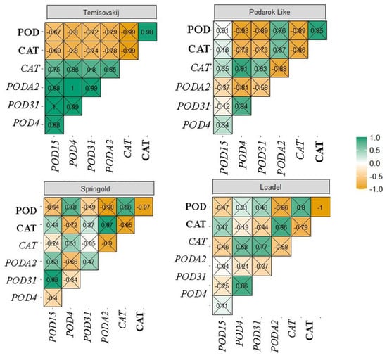 The correlation was further investigated by calculating Pearson’s product–moment correlation coefficient (p < 0.05), and a correlogram (Figure 6) was created to verify the strength of associations between the activity of antioxidant enzymes and the expression of antioxidant genes in Prunus persica. It has been demonstrated that CAT activity has a negative correlation with POD activity in “Springold” and “Loadel”, while CAT activity continues to have a positive correlation with POD in “Temisovskij”. Additionally, PODA2 has a positive correlation with PODA4.