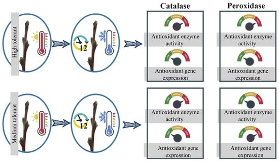 Analysis of phenotypic changes did not reveal severe bud damage, which is expected for varieties with medium to high cold tolerance. However, our results showed that the antioxidant system responded differently to cold stress in HT and MT varieties (Figure 7).