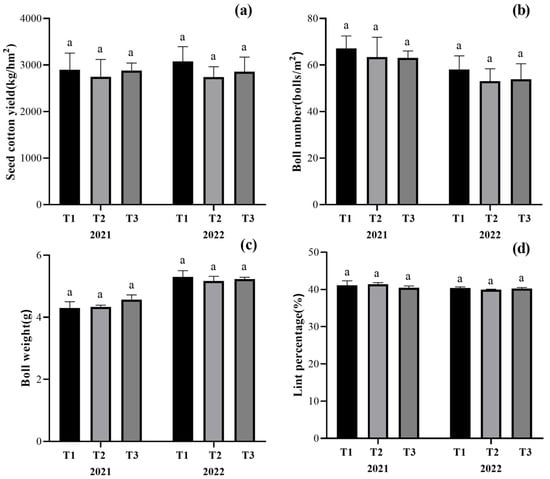 Figure 1. Effects of different green manure incorporation treatments on seed cotton yield (a), boll number (b), boll weight (c) and lint percentage (d) in studies carried out in Binzhou, Shandong, during 2021–2022. The treatments are as follows: T1—Chinese violet-cotton-Chinese violet-cotton; T2—rapeseed-cotton-rapeseed-cotton; T3—ryegrass-cotton-hairy vetch-cotton. Bars represent mean ± standard error (n = 3). Significant differences among treatments were determined using Tukey’s test at p < 0.05. Different letters above the bars indicate significant differences.