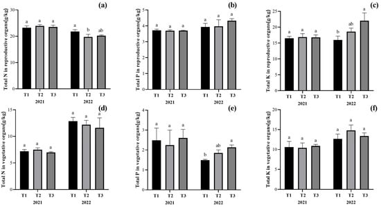 Figure 2. Effects of different green manure incorporation treatments on total N, total P, and total K contents in reproductive organs (ac), and total N, total P, and total K contents in vegetative organs (df) of cotton before harvest. Experiments were conducted in Binzhou, Shandong, during 2021–2022. The treatments are as follows: T1—Chinese violet-cotton-Chinese violet-cotton; T2—rapeseed-cotton-rapeseed-cotton; T3—ryegrass-cotton-hairy vetch-cotton. Data are presented as mean ± standard error (n = 3). Significant differences among treatments were determined using Tukey’s test at p < 0.05. Different letters above the bars indicate significant differences in nutrient contents among treatments.