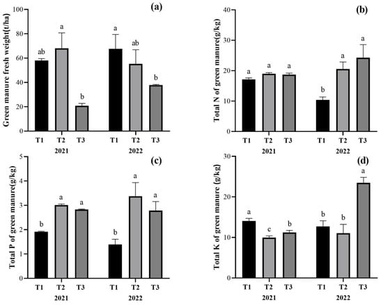 Figure 3. Differences in fresh weight (a), total N (b), total P (c), and total K (d) contents of green manure crops under different incorporation treatments. Experiments were conducted in Binzhou, Shandong, during 2021–2022. The treatments are as follows: T0—conventional full-season cotton monoculture with winter fallow; T1—Chinese violet-cotton-Chinese violet-cotton; T2—rapeseed-cotton-rapeseed-cotton; T3—ryegrass-cotton-hairy vetch-cotton. Data are presented as mean ± standard error (n = 3). Significant differences among treatments were determined using Tukey’s test at p < 0.05. Different letters above the bars indicate significant differences among treatments for each parameter.