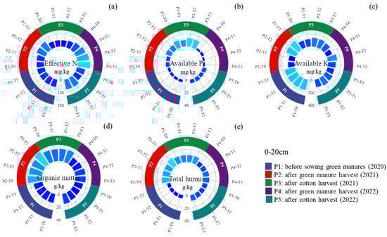 Figure 5. Differences in (a) alkali-hydrolyzed nitrogen, (b) available phosphorus, (c) available potassium, (d) organic matter, and (e) total humus in the 20–40 cm soil layer under different treatments across five sampling periods. Experiments were conducted in Binzhou, Shandong, during 2021–2022. The treatments are as follows: T0—conventional full-season cotton monoculture with winter fallow; T1—Chinese violet-cotton-Chinese violet-cotton; T2—rapeseed-cotton-rapeseed-cotton; T3—ryegrass-cotton-hairy vetch-cotton. Data are presented as the mean nutrient contents for each sampling period.