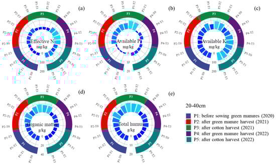 Dynamic changes in soil nutrients were analyzed over five sampling periods spanning two years (Figure 4 and Figure 5). Soil nutrient content consistently decreased with depth, and significant differences were observed across sampling periods. Before cotton planting (P2 and P4), effective nitrogen levels in both the 0–20 cm and 20–40 cm soil layers were higher under green manure incorporation treatments compared to the winter fallow control. Among the treatments, T2 and T3 demonstrated superior performance across most indicators, including effective nitrogen, available potassium, organic matter, and total humus, with T3 generally outperforming T2 in the majority of cases. These findings suggest that T3 is the most effective green manure treatment for improving soil nutrient availability and promoting long-term soil fertility, though T2 also showed strong potential.