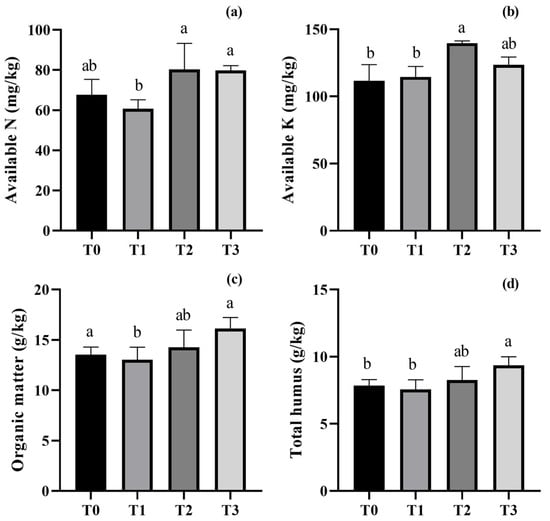Figure 6. Differences in soil available N (a), available K (b), organic matter (c) and total humus (d) among treatments at the end of the two-year rotation cycle in experiments carried out in Binzhou, Shandong, during 2021–2022. The treatments are as follows: T0—conventional full-season cotton monoculture with winter fallow; T1—Chinese violet-cotton-Chinese violet-cotton; T2—rapeseed-cotton-rapeseed-cotton; T3—ryegrass-cotton-hairy vetch-cotton. Soil nutrients, including alkali-hydrolyzed nitrogen, available phosphorus, available potassium (mg/kg), organic matter, and total humus (g/kg), were measured in the 0–20 cm soil layer after the completion of the rotation cycle. Data are presented as mean ± standard error (n = 3). Significant differences among treatments were determined using Tukey’s test at p < 0.05. Different letters above the bars indicate significant differences among treatments for each soil nutrient parameter.