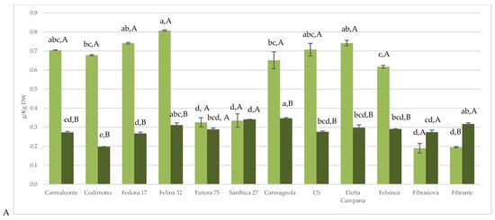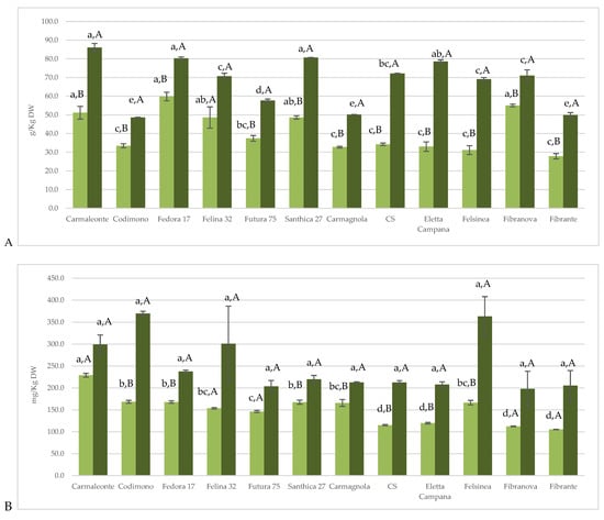 Conversely, an opposite accumulation trend, higher in apical leaves compared to the basal ones, was observed for Na and Zn contents (Figure 2), although genotype-specific exceptions were found in Futura 75, Santhica 27, Fibranova, and Fibrante for Na (Figure 2A), as well as in Felina 32 and Felsinea for Zn. Indeed, Na content ranged from 0.2 to 0.8 g/Kg DW for apical leaves and from 0.2 to 0.3 g/Kg DW for basal ones, while Zn content was far lower.