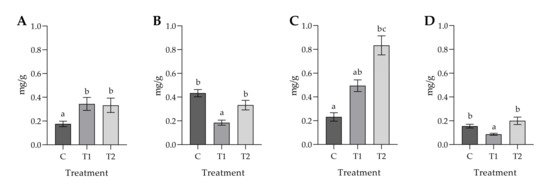 The relative expression levels of PAL were significantly increased in tobacco and common bean after the T1 and T2 treatments, respectively (Figure 5B,D).