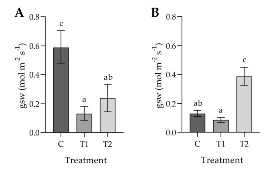 Stomatal conductance of plants irrigated with ozonated water T1 (30 min treatment) and T2 (1 h treatment) at the end of the open-field experiment measured with a porometer/fluorometer LICOR-600: (A) N. tabacum; (B) S. lycopersicum. Error bars represent the SEM. Letters indicate statistically significant differences between treatments assessed with Tukey’s post hoc tests (p-value < 0.05).