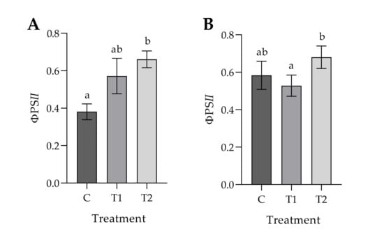 As far as PSII activity was concerned, a significant increase was observed in tobacco after the T2 treatment compared to the control (Figure 4A). Similarly, in tomatoes, a slight increase was observed after the T2 treatment, whose results were statistically significant compared to the T1-treated plants (Figure 4B).