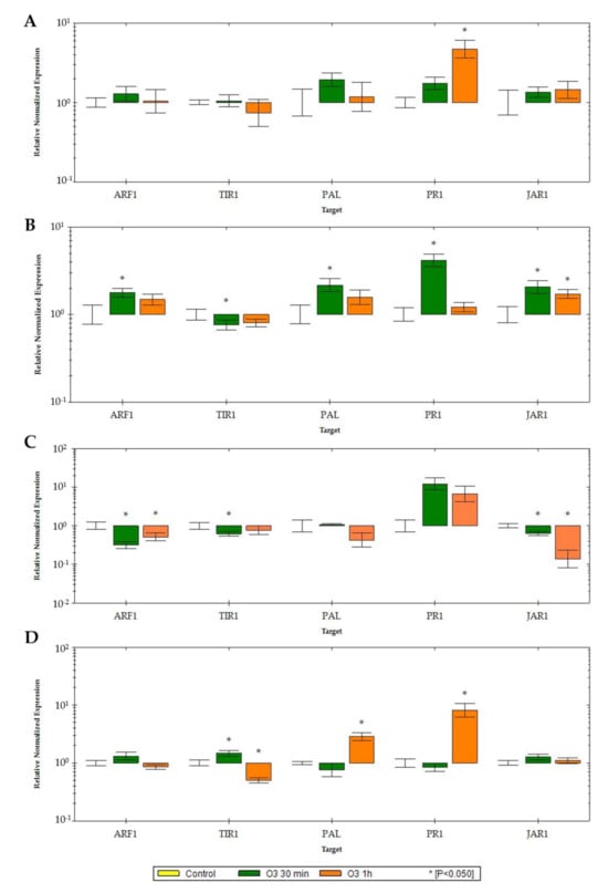Lastly, JAR1 expression was significantly induced in tobacco after ozonated water treatments (Figure 5B). A similar trend was also observed in lettuce, as shown in Figure 5A. In contrast, JAR1 was significantly downregulated in tomato plants after the treatments (Figure 5C). No variations in the expression of this gene were observed in the treated plants compared to control in common bean (Figure 5D).