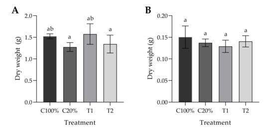 Dry weights of leaves (A) and roots (B) of hydroponically grown L. sativa plants after treatment of the C20% nutrient solution with O3 for 15 min (T1) and 30 min (T2). Error bars represent the SEM. Letters indicate statistically significant differences between treatments assessed with Tukey’s post hoc tests (p-value < 0.05).