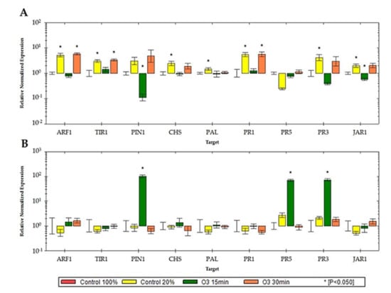 Surprisingly, the highest overexpression of defense-related genes was observed in the lettuce roots (Figure 7B). Following the treatment of the 20% nutrient solution with O3 for 15 min, a statistically significant increase was induced in the relative expression levels of PIN1, PR3, and PR5 compared to both the C100% control (Figure 7B) and the C20% control (Figure S3). A recovery in the defense response of C20% control plants was observed for ARF1 and JAR1 genes in root samples, following treatment with the 20% nutrient solution and O3 for 30 min (Figure S3).