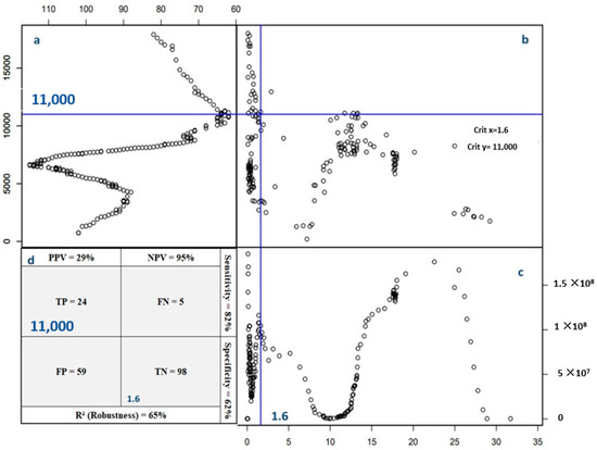 Development of a diagnostic model for grain maize using the Cate–Nelson partition: key statistical indicators and model performance metrics—(a) analysis of points outside true quadrants for yield threshold deduction; (b) yield distribution patterns relative to GNII and identification of true quadrants (true positive and true negative); (c) determination of critical thresholds using the sum of squares of GNII; (d) summary table illustrating the number of points across quadrants and associated model performance probabilities: robustness, negative predictive value (NPV), positive predictive value (PPV), specificity, and sensitivity.