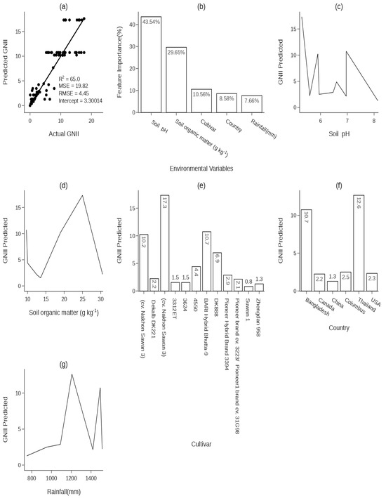 Xgboost predictions and influential factors of the global nutrient imbalance index (GNII): (a) scatter plot comparing the predicted GNII vs. the actual GNII, (b) feature importance of predictors (%), (c) predicted GNII response to soil pH, (d) predicted GNII response to soil organic matter (SOM) in g kg−1, (e) predicted GNII variability across cultivars, (f) predicted GNII response across different countries, and (g) predicted GNII response to rainfall in mm.
