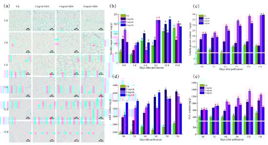 Observation of cell sections of L. cylindrica flesh cells and analyses of endogenous substances affected by exogenous ABA. The control (CK, 0 day) samples were taken from 17:00 to 18:00 h on the second day after treatment. (a) Flesh cells at six developmental stages (0 (CK), 3, 6, 9, 12, and 15 days after flowering) of L. cylindrica treated with exogenous ABA (CK, and 2, 4, and 8 mg/mL); (b–e) Content changes in endogenous soluble sugars (SS) (b), soluble proteins (SP) (c), abscisic acid (ABA) (d), and indole-3-acetic acid (auxin, IAA) content (e) in L. cylindrica fruits treated with exogenous ABA. Lowercase letters represent significant differences, p < 0.05. Bars = 50 µm.