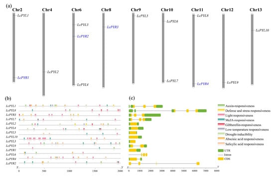 Chromosomal localisation analysis of the 14 LcPYR/PYL genes in the L. cylindrica gene using MapChart software showed that the 14 LcPYR/PYL genes were distributed on nine chromosomes, Chr2, 4, 6, 8, 9, 10, 11, 12, and 13; no LcPYR/PYL genes were found on the remaining four chromosomes (Chr1, 3, 5, 7). Specifically, LcPYL1 and LcPYR1 were located on Chr2; LcPYL2 was located on Chr4; LcPYL3, LcPYL4, and LcPYR2 were located on Chr6; LcPYL3 was located on Chr8; LcPYL5 was located on Chr9; LcPYL6 and LcPYL7 were located on Chr10; LcPYL8 and LcPYR4 were located on Chr11; LcPYL9 was located on Chr12; and LcPYL10 was located on Chr13. Thus, the LcPYR/PYL genes were unevenly distributed on the chromosomes, with the highest distribution but no gene cluster on Chr6 (Figure 2a).