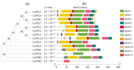 Protein evolutionary analyses showed that the genetically close proteins were LcPYL1/LcPYL8, LcPYR3/LcPYL7, LcPYL2/LcPYL4, and LcPYL5/LcPYL10, whereas LcPYL1/LcPYR2 were the most genetically distant, followed by LcPYL1/LcPYR4 (Figure 3a). An analysis of the conserved motifs of the LcPYR/PYL-encoded proteins using the MEME online website and TBtools software showed that the number and type of conserved motifs differed among the different LcPYR/PYL proteins (Figure 3b and Supplementary File S7). The motifs were distributed across 300 amino acids, and most of the proteins contained 4–7 conserved motif modules. Among them, motifs 1–5 seemed to be highly conserved. Motif 1 was present in 13 of the LcPYR/PYL proteins (except LcPYR2); motif 2 was present in 12 of the LcPYR/PYL proteins (except LcPYL6 and LcPYR2); motif 3 was present in 13 of the LcPYR/PYL proteins (except LcPYL6), and motifs 4 and 5 were present in most of LcPYR/PYL proteins. Conversely, motifs 6–12 were unevenly and lightly distributed among the 14 LcPYR/PYL proteins. Interestingly, the LcPYR2 protein sequence contained only one motif module (i.e., motif 3) that was encoded close to the 5′ end of LcPYR2, which is presumed to have undergone a large amount of genetic structural variation during its evolution.