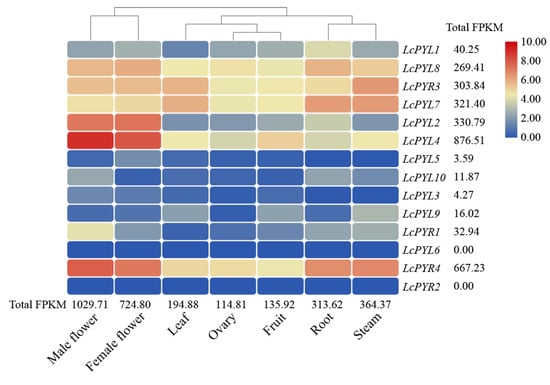 An analysis of the expression of 14 LcPYR/PYL genes in seven tissues (male flowers, female flowers, leaves, ovary, fruit, roots, stems) using the L. cylindrica transcriptome data (Supplementary File S8) detected tissue-specific expression patterns of the LcPYR/PYL gene family members. The LcPYR/PYL genes were most highly expressed in male flowers, followed by female flowers, stems, roots, leaves, fruits, and ovaries, with FPKM values of 1,029.71, 724.80, 364.37, 313.62, 135.92, 194.88, and 114.81, respectively (Figure 4). Among the seven tissues examined, LcPYL5, LcPYL3, LcPYL6, and LcPYR3 had a sum of FPKM values of <10; LcPYL6 and LcPYR3 expression was not detected (FPKM values of 0) in any of the tissues. LcPYL10, LcPYL9, LcPYR1, and LcPYL1 had sums of FPKM values ranging from 11.87 to 40.25, with a mean value of 25.27; the other six LcPYR/PYL genes had sums of FPKM values > 200. Five LcPYR/PYLs genes were most highly expressed in male flowers, especially LcPYL4 (FPKM value of 507.33) and LcPYR4 (FPKM value of 225.59). LcPYL2 and LcPYL8 were expressed predominantly in female flowers with FPKM values of 159.65 and 62.29, respectively, and LcPYR3 (87.33) and LcPYL7 (83.09) were most highly expressed in roots. Notably, the expression levels of these LcPYR/PYLs genes were relatively low in luffa at the early stage of fruit development (i.e., ovary) compared with their expression levels in the other six tissues.