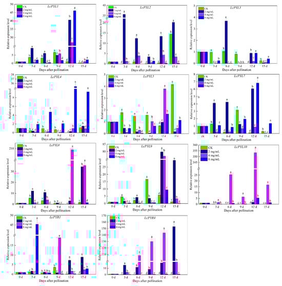 Real-time fluorescence quantitative PCR analysis of the expression levels of selected LcPYR/PYL genes associated with luffa fruit development. Samples were taken at 0 (0 d), 3 (3 d), 6 (6 d), 9 (9 d), 12 (12 d), and 15 (15 d) days after the pollination of ‘LZL-2′ luffa. CK is the control group (deionised water plus 0.05% Tween-20). Experimental groups were treated with exogenous ABA at concentrations of 2, 4, and 8 mg/mL plus 0.05% Tween-20. Lowercase letters indicate significant differences in the expression of the LcPYR/PYL genes in L. cylindrica fruits on the same day under different concentrations of ABA treatments (p < 0.05). The Lc18s rRNA gene was used as the internal control. Error bars indicate the standard error of three biological replicates.