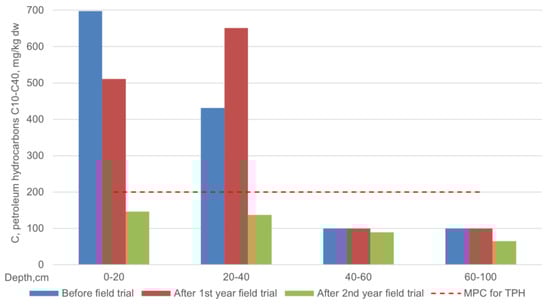 Figure 1 shows the concentration of heavy (C10–C40) petroleum hydrocarbon fraction in the contaminated soil at the Šiauliai site before and after field trials. Since the site was used as an oil storage facility in the past, diesel and oil fractions prevailed over other contaminants. The light fraction petroleum hydrocarbons (C6–C10) were almost undetectable even during the initial characterization; therefore, it is not included in Figure 1 but the data can be found in Table 4. According to Lithuanian legislation, the maximum permissible concentration (MPC) for petroleum hydrocarbons in the soil in areas with low sensitivity is 200 mg/kg [38]. Therefore, the obtained results are highly promising. It was possible to reduce TPH pollution (from a maximum of 700 mg/kg) in all evaluated depths to the limit value within 2 years following the implementation of soil remediation measures.