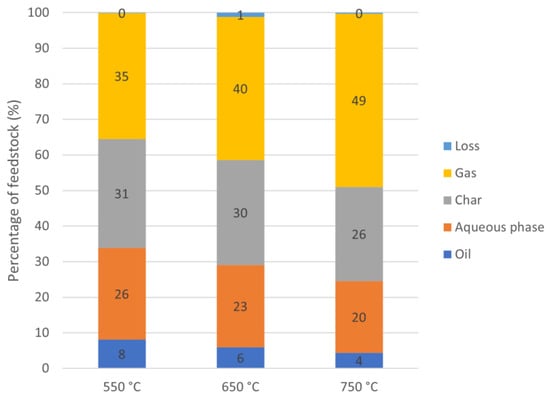The conversion trials indicate that the biomass from Jerusalem artichokes can be effectively transformed into energy-dense intermediates using thermo-catalytic reforming technology (Figure 2). Most of the initial mass is converted to TCR®-gas independent of the applied post-reformer temperature. Biochar is the second largest fraction, followed by the aqueous phase and the bio-oil. Figure 2 also illustrates a clear relationship between product distribution and the post-reformer temperature. The TCR®-gas fraction declines at a lower post-reformer temperature (550 °C), whereas the fractions for bio-oil, aqueous phase, and biochar increase. The losses shown in Figure 2 correspond to product residues within the TCR®-unit during the recovery of the TCR®-products.