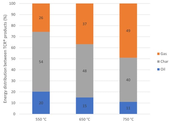 After the mass balance, an energy balance was conducted to gain insights of the energy distribution within the TCR®-products. Figure 3 shows the energy distribution within the TCR®-products. According to Figure 3, most of the TCR®-product’s energy is present in the TCR®-gas. About 49% of the product’s energy can be found in the TCR®-gas for a post-reformer temperature of 750 °C. In analogy to the changing mass distribution at lower PR temperatures, the energy distribution within the TCR®-products also shifts in favor of biochar and bio-oil. The energy content of the aqueous phase is not considered in the energy balance as it normally has a specific energy content of less than 0.2 MJ/kg [52].