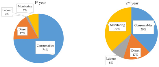 Mostly due to the first year costs, which consisted of site preparation and remediation establishment activities (74%): debris removal, deep power harrowing, and leveling for pilot site homogenization, and application of a biological additive (Figure 4). In the second year, with a significant reduction in consumable expenses, the costs were distributed as follows: 38% for monitoring, 37% for consumables, 17% for fuel, and 8% for labor (Figure 4).