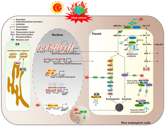 Heat stress signaling and responses in rice endosperm. Rice is more sensitive to heat stress at grain-filling stages than the vegetative stage. High temperature (HT) downregulates the expression of starch-synthesis-related genes (SSRGs) and the stability of their encoded enzymes, especially those encoding AGPase and GBSSI, leading to defective chalkiness and impaired starch accumulation. Several key transcription factors (highlighted in red) are involved in the stimulation or inhibition of SSRGs at the transcriptional level. At the post-translational level, phosphorylation affects starch synthesis by promoting the formation of multi-enzyme complexes. Abscisic acid (ABA) synthesized in rice leaves directly activated the expression of most of the SSRGs and multiple hub transcription factors in rice caryopsis after long-distance transport from leaves to caryopsis. Grain filling defect 1 (DG1)-mediated long-distance transport of ABA is sensitive to high temperatures during seed development. Heat stress transcriptionally activates HS, alters membrane fluidity and permeability, affects the activity of membrane proteins, and causes chloroplast and mitochondrial dysfunction. This leads to an increase in intracellular ROS and ROS second messengers, rapidly activating downstream regulatory networks. OsHsp60-3B interacted with FLO6 to regulate the biosynthesis of starch granules in rice pollen at HT, reduce the level of ROS in anthers, and ensure the normal development of male gametophytes in rice. The WCR1 interacted with MT2b to maintain its protein stability, thereby reducing ROS accumulation, reducing chalkiness, and improving grain quality. HSF triggers a transcriptional cascade to activate the expression of downstream genes including HSP, HSF, and HSP, which can help to maintain the normal physiological metabolism by stabilizing unfolded proteins and promoting the renaturation of aggregated proteins induced under heat stress. By regulating ONAC127/129, MADS box, bZIP60, bZIP58, Hsp70cp-2, and Hsp40cp-1, these factors maintain the normal development of endosperm, promote endosperm starch biosynthesis, reduce grain chalkiness, and improve grain quality.