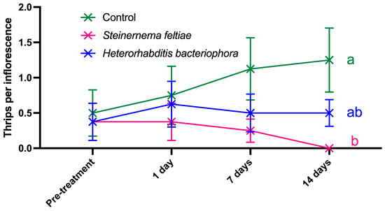 Mean population of Frankliniella occidentalis per inflorescence (±standard error) in a nectarine orchard at Edessa in 2023, following treatments with Nemasys H® (Heterorhabditis bacteriophora) and Nemasys F® (Steinernema feltiae). Different letters at lines indicate significant differences between treatments (p < 0.05, Tukey HSD test).