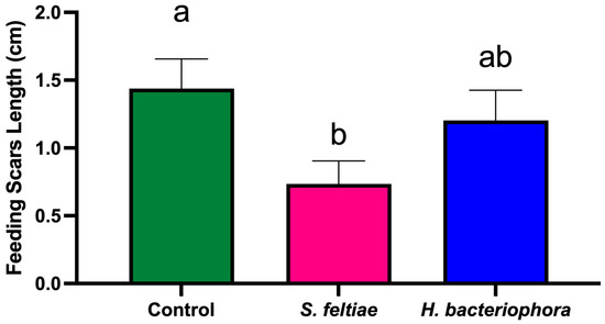 Significant differences were observed in both the number of feeding scars (F2,477 = 5.96, p < 0.003) and the total length of scars (F2,477 = 4.52, p < 0.011) on fruits from nematode-treated trees compared to untreated trees. Fruits from trees treated with S. feltiae had significantly fewer and shorter scars compared to the control (Figure 2 and Figure 3). In contrast, fruits from trees treated with H. bacteriophora did not differ significantly from the control or from fruits on S. feltiae-treated trees.