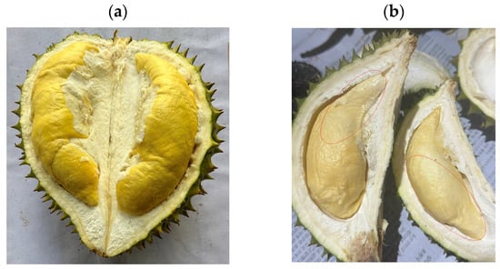 All durian fruits in a given tree were weighed at harvest to determine the fruit yield of the tree (kg tree−1). Three durian fruits, ranging from 2.0 to 2.5 kg in weight and showing no signs of physiological or pest damage, were selected randomly in each replicate to evaluate fruit quality. After opening the durian fruit, the UFR parameter was first determined visually (Figure 1). We measured the total flesh (aril + seed) in each durian fruit, then assessed the flesh for UFR and recorded the UFR percentage rate. Next, the fruits were divided into three parts—aril, seed, and peel—and weighed to determine their representative portions in the fruit mass. Finally, parameters such as color, total soluble solids (TSS), and titrate acidity (TA) of the durian aril were measured.