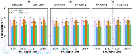Soil moisture values under different treatments at three durian orchards ((a). SR1, (b). SR2, and (c). SR3) during two consecutive seasons (2022–2023 and 2023–2024). PM, plastic mulching a month before durian fruit harvest; PH, polyhalite fertilizer application (3 kg tree−1 year−1); and PM + PH, polyhalite fertilizer application (3 kg tree−1 year−1) and plastic mulching a month before durian fruit harvest. The farmer’s fertilization practice (450 g N–450 g P–450 g K per tree−1 during the fruit development period) was used in all treatments. Different letters indicate significant differences at p < 0.05. Error bars in the columns indicate standard error (n = 3).