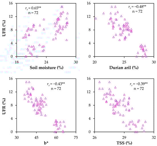 The relationship between uneven fruit ripening (UFR) rate, soil moisture (0–20 cm), and durian fruit quality. TSS, total soluble solids. ** indicates a significant difference at p < 0.01 according to Spearman’s correlation type (rs).