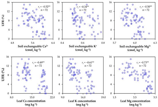 Correlation between uneven fruit ripening (UFR) rate and soil exchangeable cations (0–20 cm) and leaf nutrients. ** indicates a significant difference at p < 0.01 according to Spearman’s correlation type (rs).