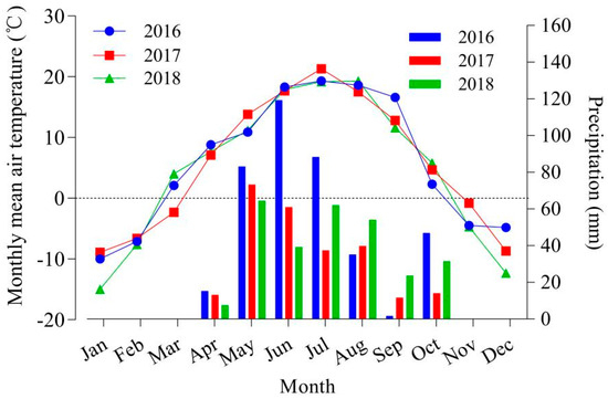 Precipitation distribution and air temperature in the experimental field from 2016 to 2018.