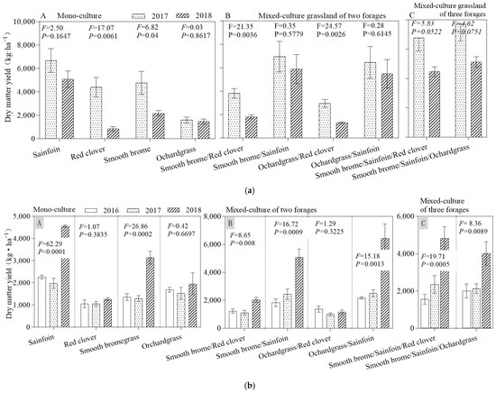 (a) Comparison of dry matter yields as hay between years 2017 and 2018 under mowing utilization. (b) Comparison of dry matter yields as grazing among years 2016, 2017, and 2018 under grazing utilization. Note: (A) presents a monoculture grassland of smooth bromegrass, sainfoin, red clover and orchardgrass; (B) presents mixed-culture grasslands of smooth bromegrass/red clover, smooth bromegrass/sainfoin, orchardgrass/red clover, orchardgrass/sainfoin. (C) presents mixed-culture grasslands of smooth bromegrass/sainfoin/red clover and smooth bromegrass/sainfoin/orchardgrass.