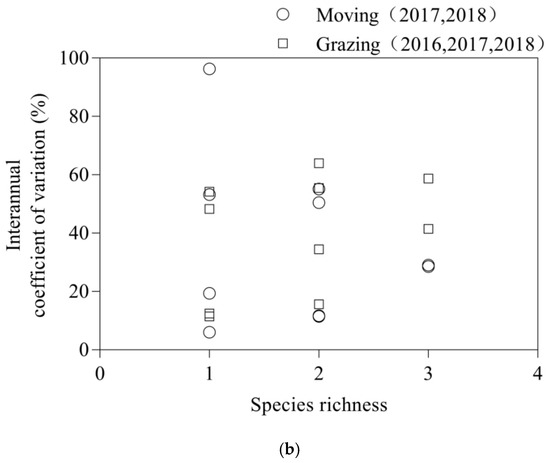 (a) The interannual variation coefficient of dry matter yield and its relationship with the species number in the pure and mixed grasslands. (b) The interannual variation coefficient of dry matter yield and its relationship with the species number in the pure and mixed grasslands.