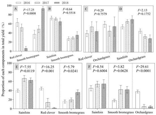Proportions of each component in total yield for 2016, 2017, and 2018 under different mixed treatments (%). Note: (A–D) represent mixed-culture grasslands of smooth bromegrass/red clover, smooth bromegrass sainfoin, orchardgrass/red clover, and orchardgrass/sainfoin, respectively; (E,F) represent mixed-culture grasslands of smooth bromegrass/red clover/sainfoin and smooth bromegrass/orchardgrass/sainfoin, respectively.