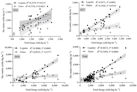 The relationship between the DMY of legume and grass and the total DMY in the mixed grassland (2016, 2017, 2018, and total). Note: (a–c) represents the years 2016, 2017 and 2018; (d) represents the total DMY over the three years from 2016 to 2018.
