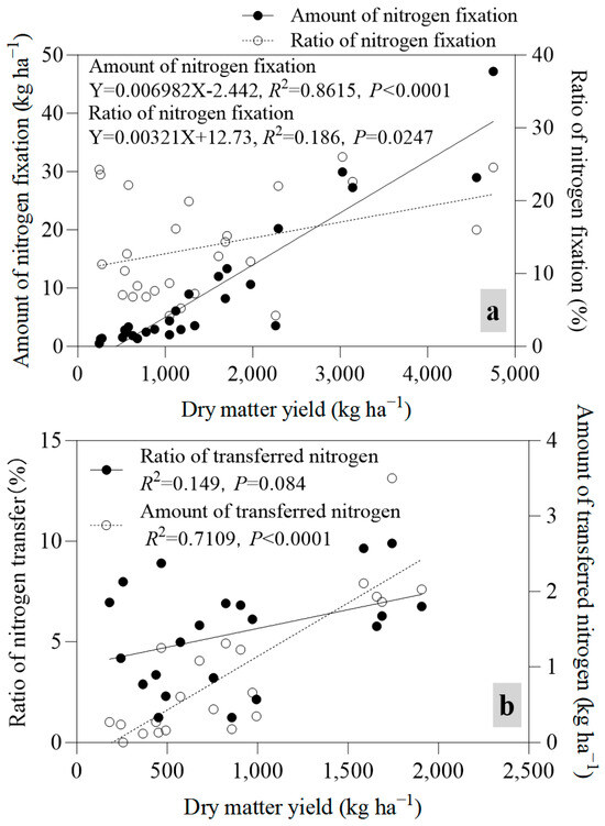 The relationship between the ratio and amount of nitrogen fixation of legume and nitrogen transfer from legume to grass and dry matter yields in mixed grasslands. Note: (a) represent the relationship between dry matter yields and the ratio and amount of nitrogen fixation of legume; (b) represent the relationship between dry matter yields and the ratio and amount of nitrogen transfer from legume to grass and biomass.