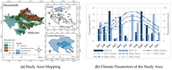 (a) Location of the study area in Central Macedonia, Greece; (b) monthly precipitation and mean, max, and min temperatures of the study area for 2016 and 2017.