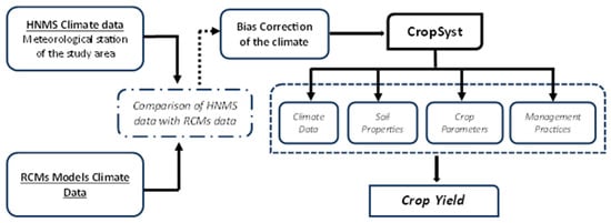 Considerable attention has been given to the development of a user-friendly interface, which provides a weather generator, utility programs, and links to GIS software [20]. CropSyst simulates the soil–water budget, soil–plant nitrogen budget, crop phenology, canopy and root growth, biomass production, crop yield, residue production and decomposition, soil erosion, and soil salinity [22]. The above processes are influenced by weather, soil characteristics, crop characteristics, and cropping system management options, such as crop rotation, cultivar selection, irrigation scheduling, nitrogen fertilization, water salinity, tillage operations, and residue management. The simulation of the water budget includes precipitation, irrigation, runoff, interception, water infiltration and redistribution in the soil profile, crop transpiration, and evaporation. The nitrogen budget involves nitrogen application, nitrogen transport and transformations, ammonium absorption, and crop nitrogen uptake. A significant feature of CropSyst is its incorporation of carbon dioxide (CO2) dynamics for assessing the impacts of increasing atmospheric CO2 levels on crop growth and yield. By simulating the interaction between CO2 concentration and plant physiological processes, the model can evaluate how increased CO2 influences photosynthetic and transpiration rates, water-use efficiency, and overall biomass production. CO2 was taken into account through the CropSyst model, considering it as both an initial concentration and an annual rate for each simulation run. Specifically, CO2 concentration values for the historical period 1980–2000 range from 338.36 to 368.87 ppm. For the periods 2030–2050 and 2080–2100, CO2 concentrations under RCP4.5 are projected to be between 435.05 and 486.54 ppm and between 531.14 and 538.36 ppm, respectively. The RCP8.5 scenario indicates CO2 concentrations of 448.84 to 540.54 ppm for 2030–2050 and significantly higher values of 758.18 to 935.87 ppm for 2080–2100. The above concentrations of CO2 were derived from projections based on RCP scenarios. Figure 2 presents a flowchart describing the methodology employed in CropSyst for crop yield simulation.