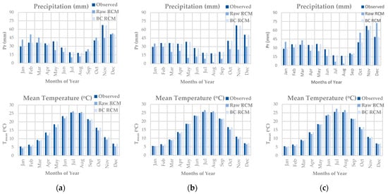 Mean monthly observed and RCA4 climate datasets (precipitation and mean temperature) before and after bias correction during the historical period (1980 to 2000) according to (a) CNRM-CM5, (b) IPSL-CM5A-MR, and (c) HadGEM2-ES.