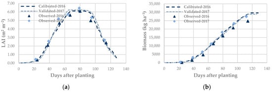 Observed and simulated (a) leaf area index and (b) aboveground biomass during the calibration and validation periods (2016 and 2017).