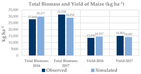 The observed and simulated total aboveground biomass (kg ha−1) and yield (kg ha−1) at the end of the growing seasons of 2016 and 2017 are shown in Figure 5. For the calibration year 2016, the observed yield was 13,450 kg ha⁻1 and the observed total biomass was 27,654 kg ha⁻1, while the simulated yield was 14,357 kg ha⁻1 and the simulated total biomass was 29,577 kg ha⁻1. The percentage differences between the observed and simulated total biomass and maize yield were both 7% for the 2016 calibration year. For the 2017 validation year, the observed yield was 14,965 kg ha⁻1 and the observed total biomass was 31,250 kg ha⁻1, with the simulated yield at 14,007 kg ha⁻1 and the simulated total biomass at 28,818 kg ha⁻1. The percentage differences between observed and simulated total biomass and yield were 8% and 7%, respectively, with the simulated values being lower compared to the observed.