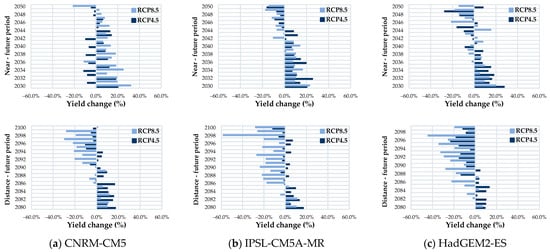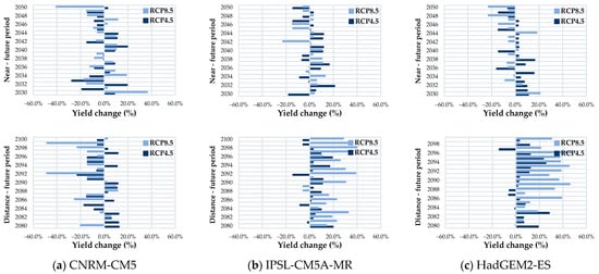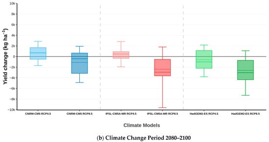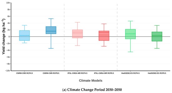Regarding CNRM-CM5, a positive effect on yield was estimated under RCP4.5, giving an increase of 2.3% during the 2030–2050 period and 4.0% during the 2080–2100 period, while under the RCP8.5 scenario, there was a higher increase (9.6%) for 2030–2050. For the IPSL-CM5A-MR model, the projections showed crop yield increases (except for RCP8.5 for 2080–2100), with the highest increase of 5.8% observed under RCP4.5 during the 2030–2050 future period. The HadGEM2-ES model produced yield decreases in most cases, ranging from 0.1% to 15.8% under RCP8.5 for 2030–2050 and 2080–2100, respectively.
