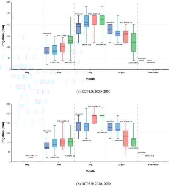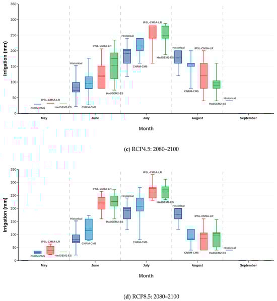 Monthly irrigation amounts for maize during the mid-term and long-term climate change periods under the RCP scenarios according to the three RCMs are presented in Figure 7. Maize irrigation amounts were predicted to change due to future climate alterations, with variations contingent upon the month. As documented, the uncertainty in monthly irrigation increases further into the future, showing a broader range of possibilities influenced by the selected Regional Climate Model (RCM) and RCP scenario. Maize irrigation amounts are highest in July and August, with the lowest requirements recorded in May and September. Irrigation amounts are projected to increase in June and July for both scenarios and climate change periods, while a decrease in monthly averages is expected for August. Furthermore, irrigation increases are observed in May under RCP8.5 during the 2080–2100 period, as projected by the three RCMs. However, there is no shift in the month (July) where the peak irrigation amount is observed. Changes in irrigation amounts, whether increases or decreases, depend on the selected RCM and RCP scenario. These changes are more pronounced during the 2080–2100 period compared to 2030–2050, reflecting greater temperature increases and more pronounced precipitation changes simulated by the CropSyst model for the long-term climate change period. Irrigation shifts are greater moving further into the future, with the greatest changes observed according to the high-emission scenario RCP8.5 for 2080–2100. In most cases, uncertainty increases further into the future, as indicated by the wider range between the first and third quartiles and more extended whiskers/outliers.