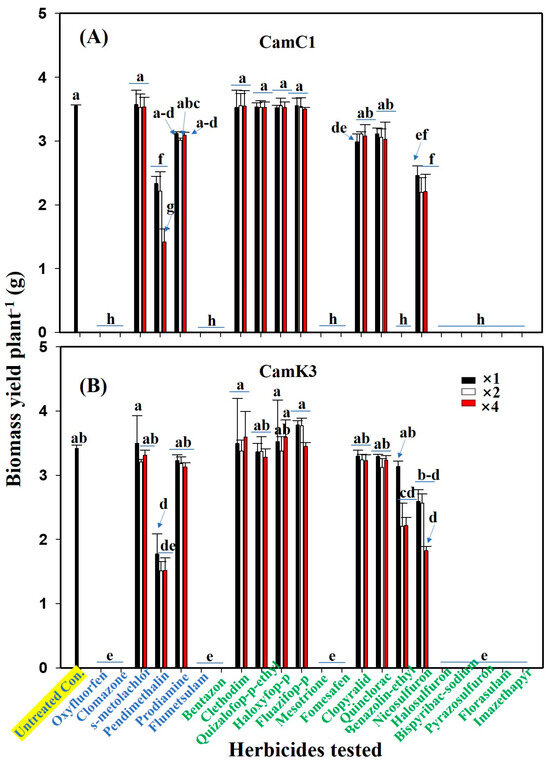 Greenhouse study for the evaluation of the effect of post-application of 22 herbicides at three application doses (×1, ×2, and ×4 of standard dose) on biomass yield per plant (g) of CamC1 (A) and CamK3 (B), respectively. Of the 22 herbicides, 6 herbicides (e.g., oxyfluorfen, clomazone) are registered as pre-emergence herbicides, and the remaining 16 herbicides (e.g., bentazon, clethodim) are registered as post-emergence herbicides. The values reported are the mean of biomass yield per plant (g) ± standard errors. Means with the same letter are not significantly different by Tukey post-hoc tests at p < 0.05.