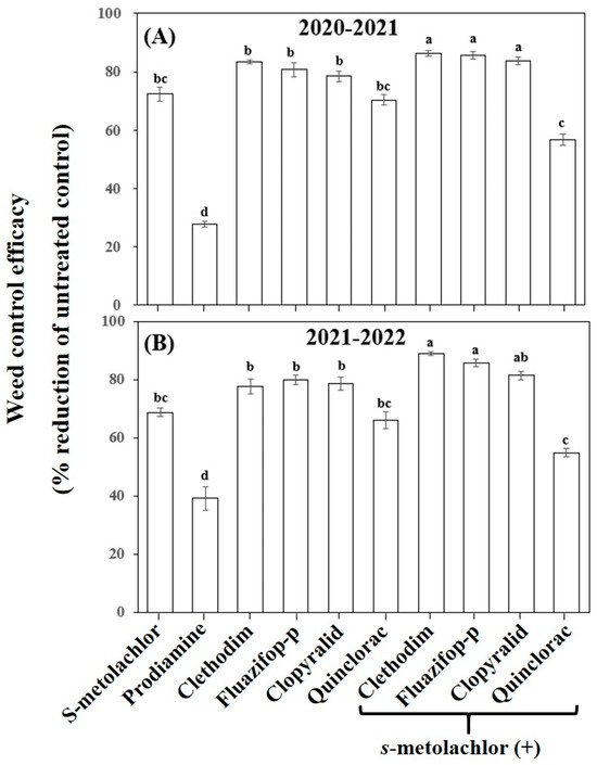 Weed control efficacy (% reduction in the untreated control) for CamK3 field plots treated with the screened herbicides (×1 of standard dose) in 2020–2021 (A) and 2021–2022 (B). Field herbicide treatments included the single pre-application of s-metolachlor and prodiamine, post-application of clethodim, fluazifop-p, clopyralid, and quinclorac, and sequential application combining s-metolachlor and post-emergence herbicides (clethodim, fluazifop-p, clopyralid, and quinclorac). The values reported are the mean of weed control efficacy ± standard errors. Means with the same letter are not significantly different by Tukey post-hoc tests at p < 0.05.