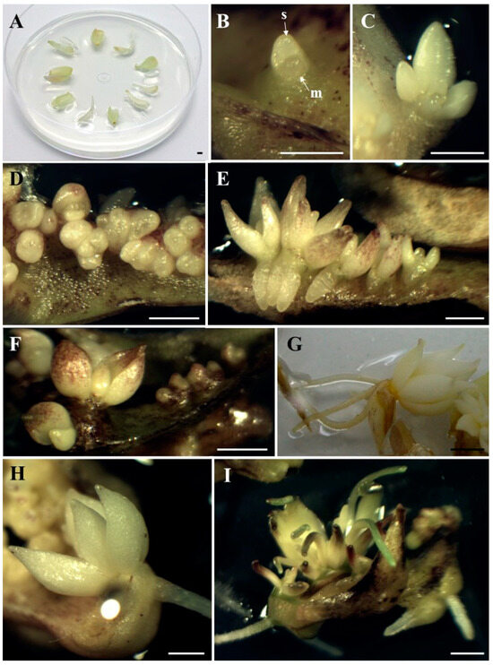 Bulb scale explants (A). Direct formation of the adventitious bulb with visible apical meristem (m) and first bulb scale (s) under the influence of blue light × 3% sucrose × 0.5 µM BAP, after 4 weeks of cultivation (B); an adventitious bulb forming under the influence of red light × 3% sucrose, after 6 weeks of cultivation (C); group of adventitious bulbs, under the influence of white light × 6% sucrose after 5 weeks of cultivation (D) and 9 weeks of cultivation (E); bulbs formed under influence of blue light × 6% sucrose, after 6 weeks of cultivation (F); well-developed rooted bulb, formed after 12 weeks of cultivation: in darkness × 3% sucrose × 0.5 µM BAP (G) and under the influence of red light × 6% sucrose × 0.5 µM BAP (H); adventitious bulbs with developing roots and leaves, under the influence of white light × 6% sucrose × 0.5 µM BAP, after 12 weeks of cultivation (I). Bar: 2 mm.
