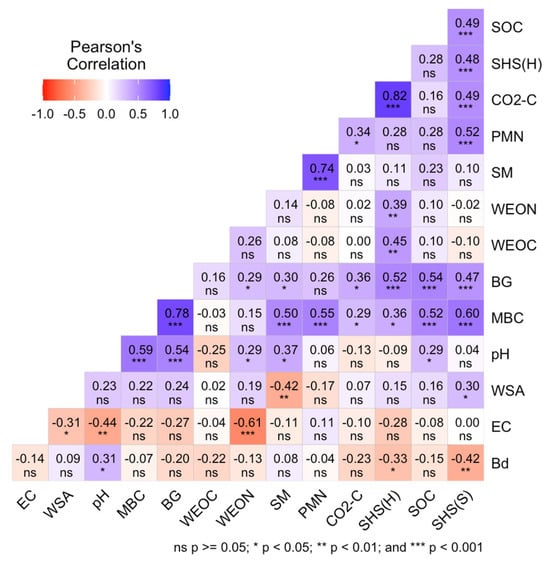 Pearson correlation coefficient diagram of the soil health indicators and overall soil health scores (SHSs) from the Soil Management Assessment Framework (SMAF) and Haney Soil Health Tool (HSHT). Significant levels of p < 0.05, p < 0.01, and p < 0.001 are shown according to the correlations between each indicator. SM = soil moisture, Bd = bulk density, WSA = water-stable aggregates, EC = electrical conductivity, MBC = microbial biomass carbon, PMN = potentially mineralizable nitrogen, SOC = soil organic carbon, BG = β-glucosidase activity, SHS (S) = Soil Management Assessment Framework overall soil health score, CO2-C = Solvita 24 h CO2-C burst, WEOC = water-extractable organic carbon, WEON = water-extractable organic nitrogen, SHS (H) = Haney Soil Health Tool soil health score.